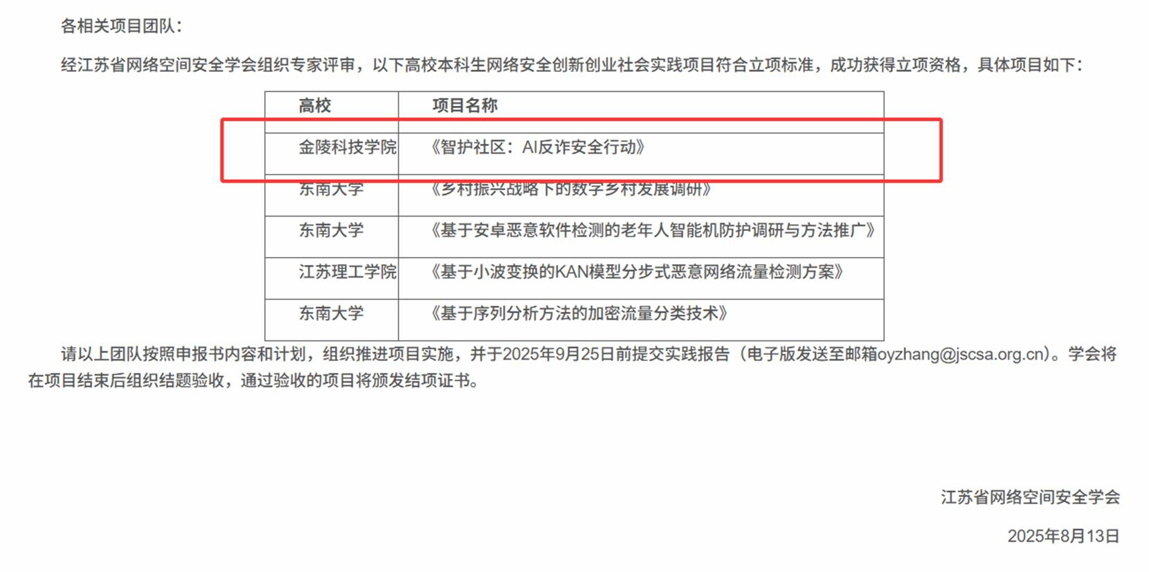 8月13日,江苏省网络空间安全学会公布2024年高校本科生网络安全创新创业社会实践项目立项结果,金陵科技学院网络安全学院申报的《智护社区:AI反诈安全行动》成功获批。全省仅5个项目入选,我院项目聚焦人工智能反诈技术,服务社区安全,充分展现学生创新实践能力与社会责任担当。项目团队将按申报计划推进实施,并于9月25日前提交实践报告,迎接省级结题验收。