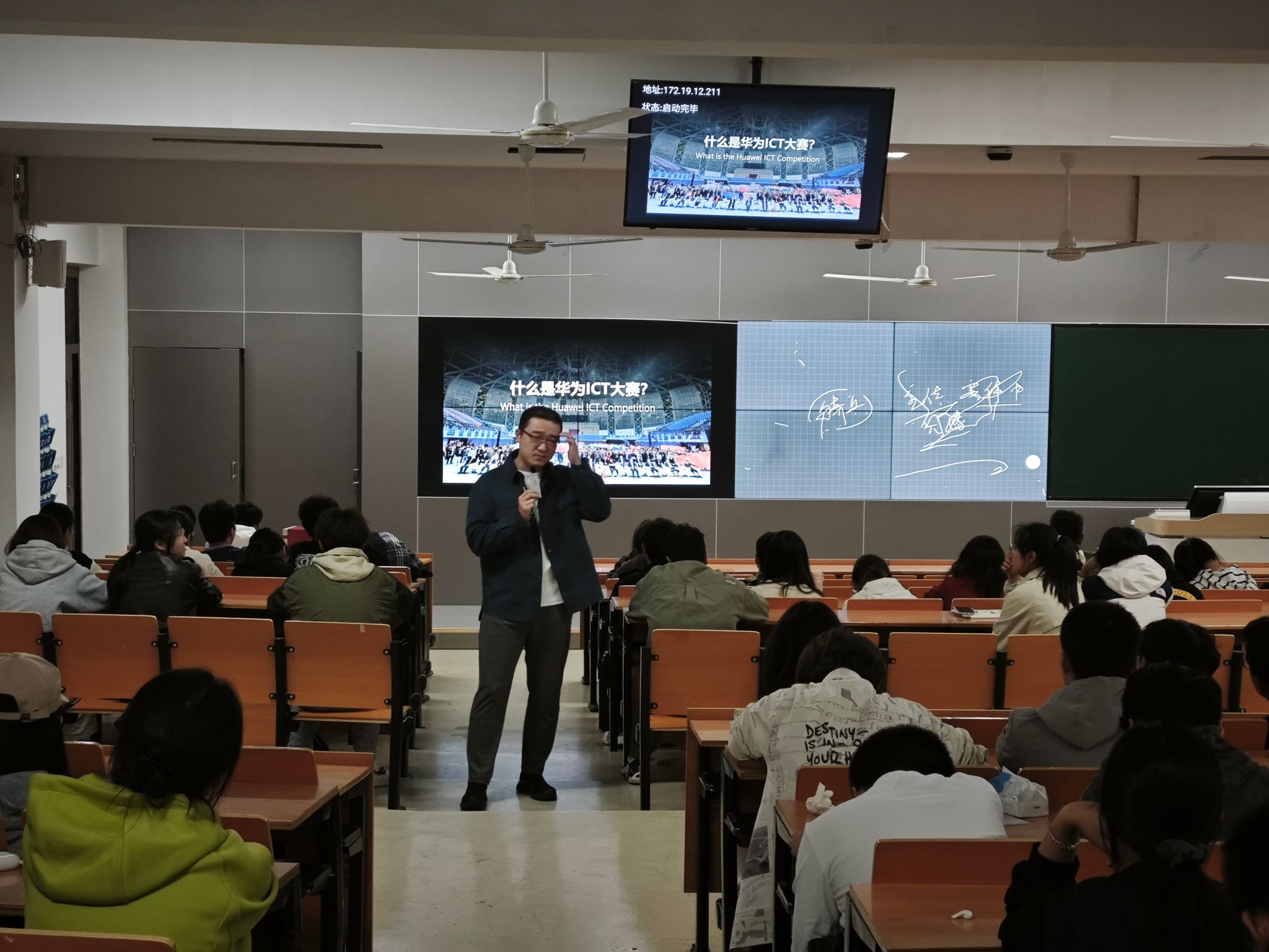 会议期间,学院网工系翟洪军老师首先为同学们解读了我校《本科生创新创业实践教育学分认定与管理办法(试行)》,鼓励同学们积极参加专业相关的学科竞赛,通过以赛促学的方式培养创新实践能力。随后,“新华三杯”大赛江苏赛区负责单位建策科技的相关负责人对第十五届“新华三杯”大赛的赛程、参与方式、奖项设置进行了解读,并以网络工程专业往届学长为例,分享了通过积极参加专业相关的学科竞赛,对个人学业与技术成长、就业深造等方面的巨大推动作用,增强了新生们对专业发展与就业前景的信心。嘉环科技的工程师也为同学们带来了华为ICT大赛的精彩介绍。他现场演示了报名流程,详细说明了大赛以三人组队形式参赛及划分的四个不同赛道,并引导感兴趣的同学进行初步的赛道选择。通过分析了华为ICT大赛在考研复试和就业求职简历中的显著优势,指出获奖经历不仅能助力深造,更能为未来高质量就业奠定坚实基础。