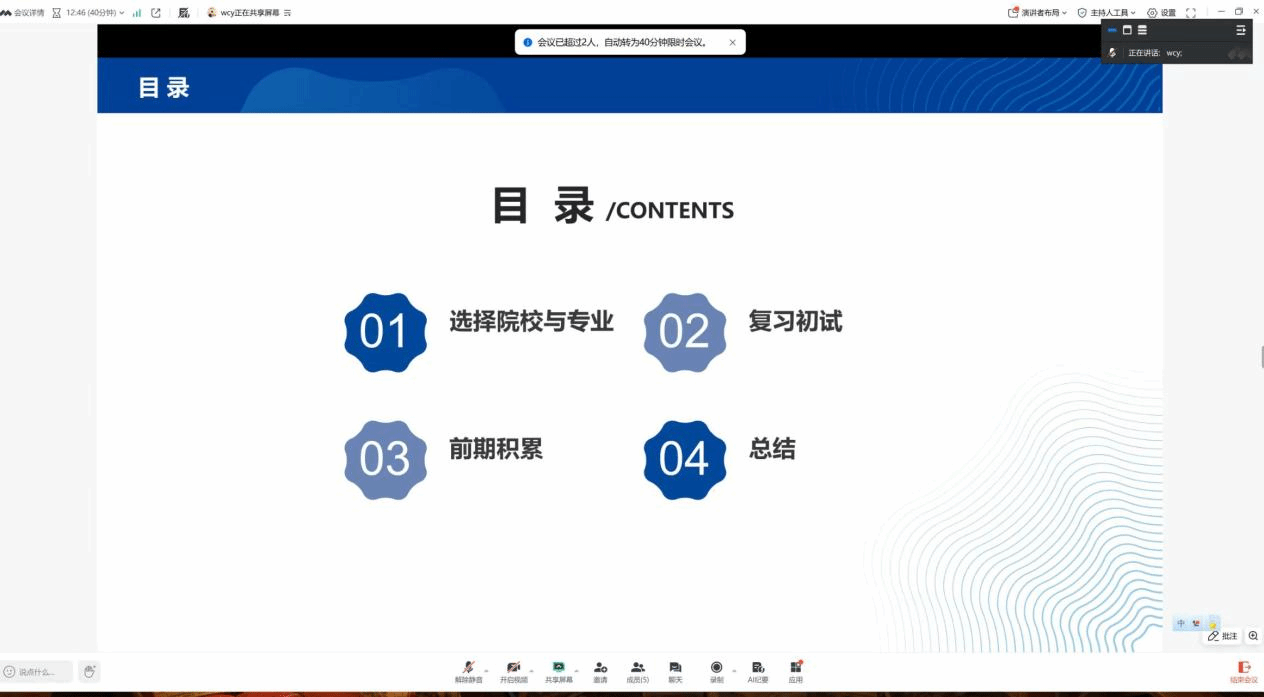 随着考研竞争日趋激烈,提前规划、科学备考已成为成功的关键。吴春燕学姐结合自身备考全程,进行了系统梳理与无私分享。从择校择专业的“避坑指南”、复习计划的科学制定,到公共课与专业课的备考策略、重难点突破方法,再到复试流程的细节把控、心态调整的实用技巧,学姐以真实经历还原了备考路上的挑战与收获,将自己总结的高效学习方法、时间管理技巧一一倾授,内容具体可操作,让在场同学受益匪浅。参会同学纷纷表示,学姐的分享内容具体、实在,不仅加深了对考研全过程的认识,也增强了面对挑战的勇气和策略意识,对未来的学业规划有了更清晰的思路。